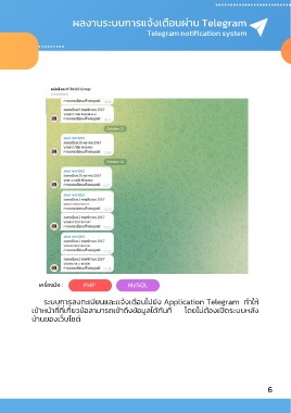 ผลงานระบบการแจ้งเตือนผ่าน Telegram Telegram notification system เครื องมือ : PHP MySQL ระบบการลงทะเบียนและเเจ้งเตือนไปยัง Application Telegram ทําให้ เข้าหน้าที ที เกี ยวข้อสามารถเข้าถึงข้อมูลได้ทันที โดยไม่ต้องเป ดระบบหลัง บ้านของเว็บไซต์ 6
